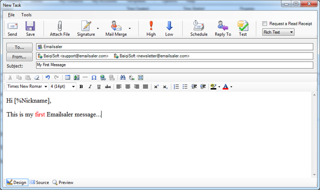 The Emailsaler message editor is similar to standard email client editors like Outlook or Outlook Express. It provides settings for changing the appearance of your messages like users can add background color to message, change the font of text, add graphics, table, signature, hyperlinks, attachments and other HTML elements as desired.